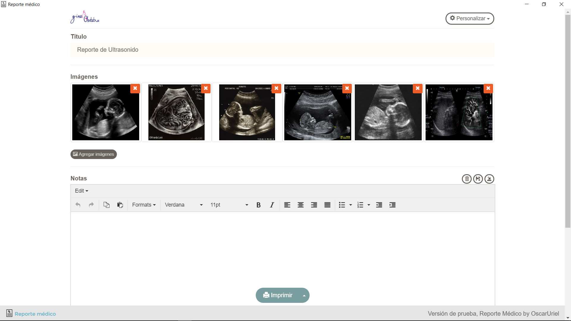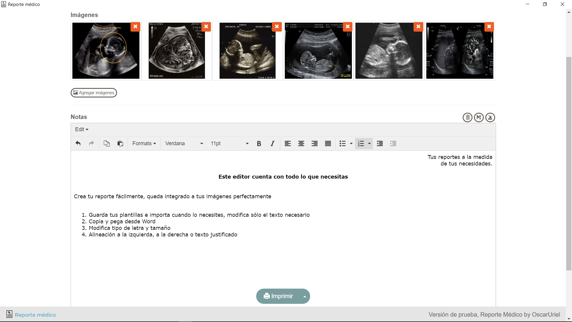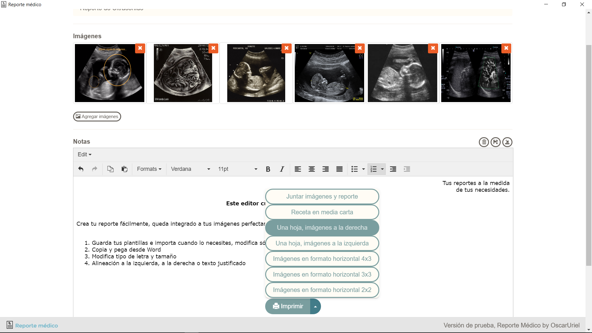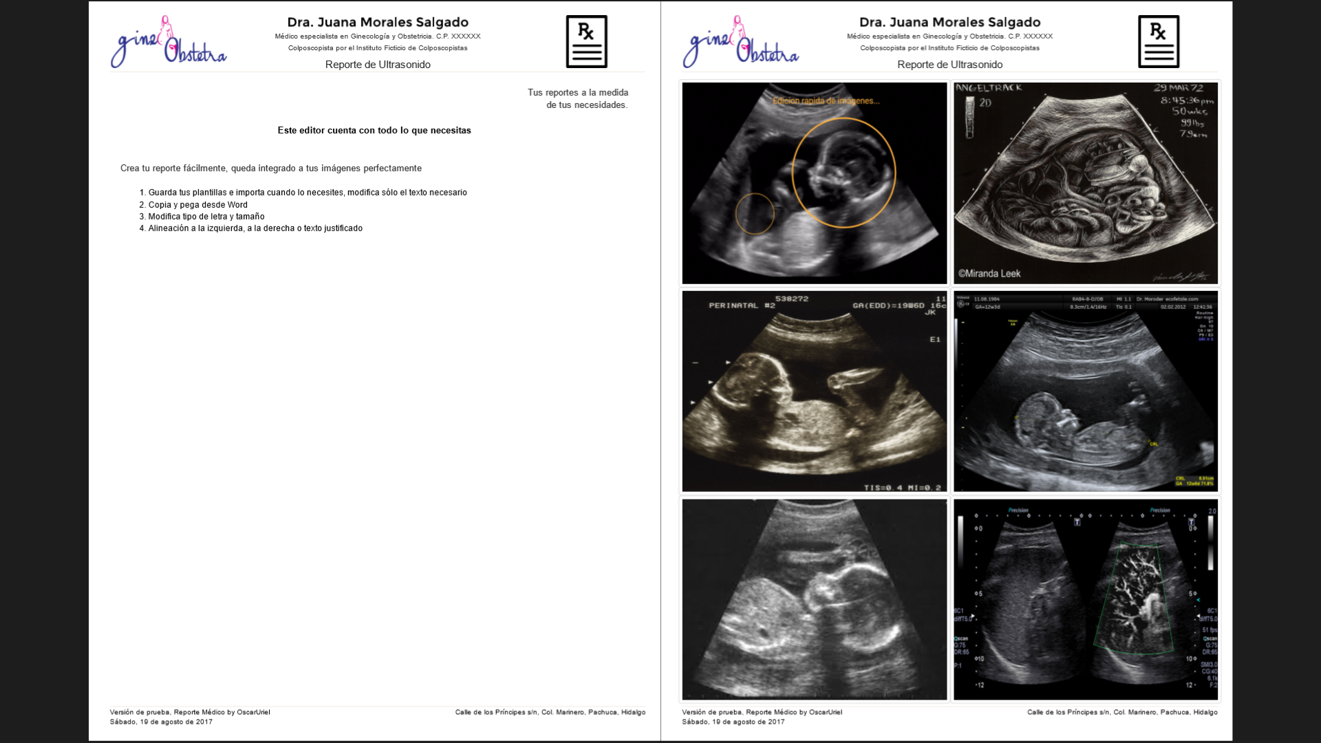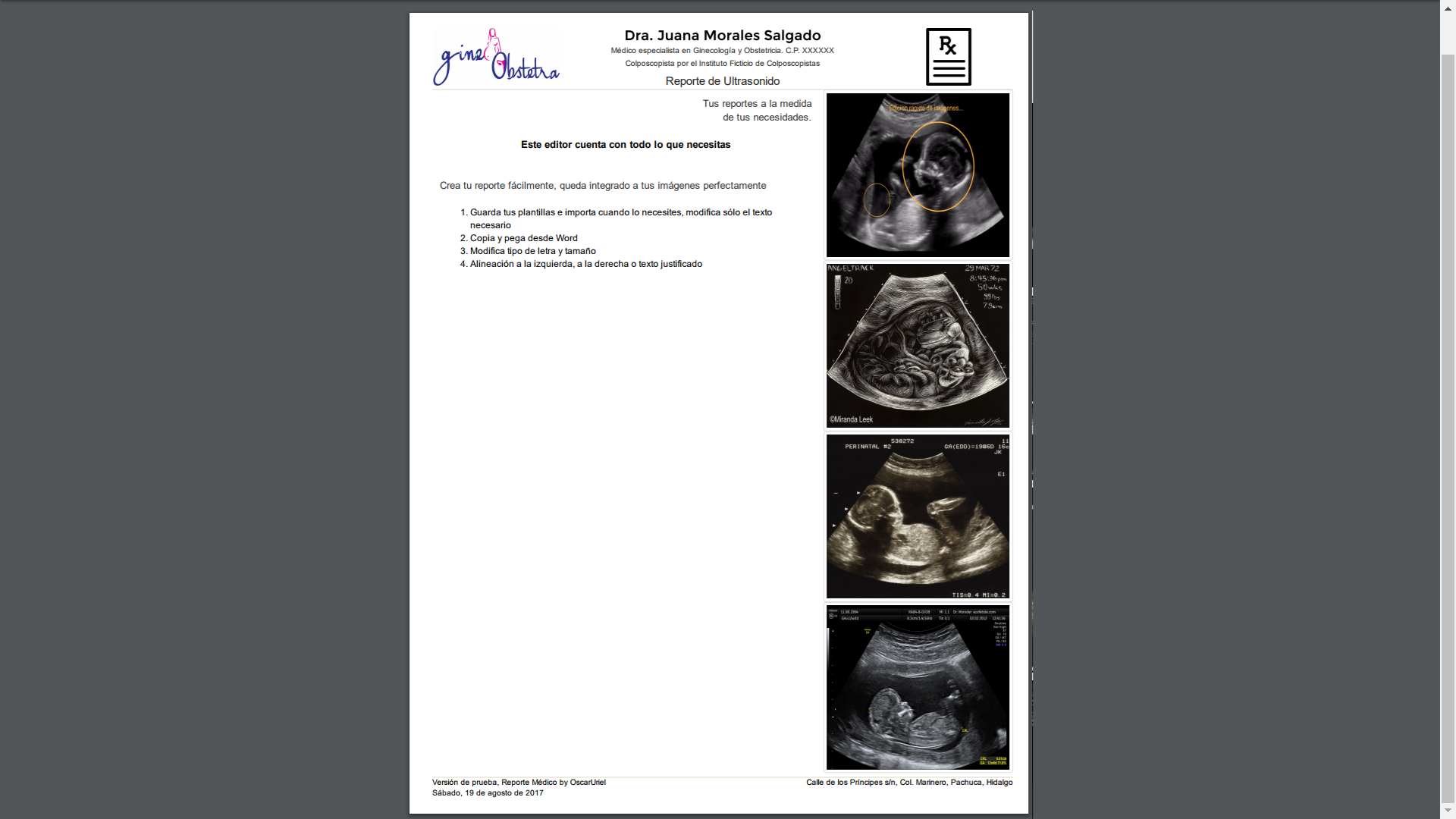 Con este programa puedes crear tus reportes de ultrasonido o colposcopía de una manera fácil y rápida. También puedes crear notas generales o recetas. Este programa funciona en Windows, Mac y no requiere de instalación, únicamente descargas un archivo zip, descomprimes y está listo para usarse